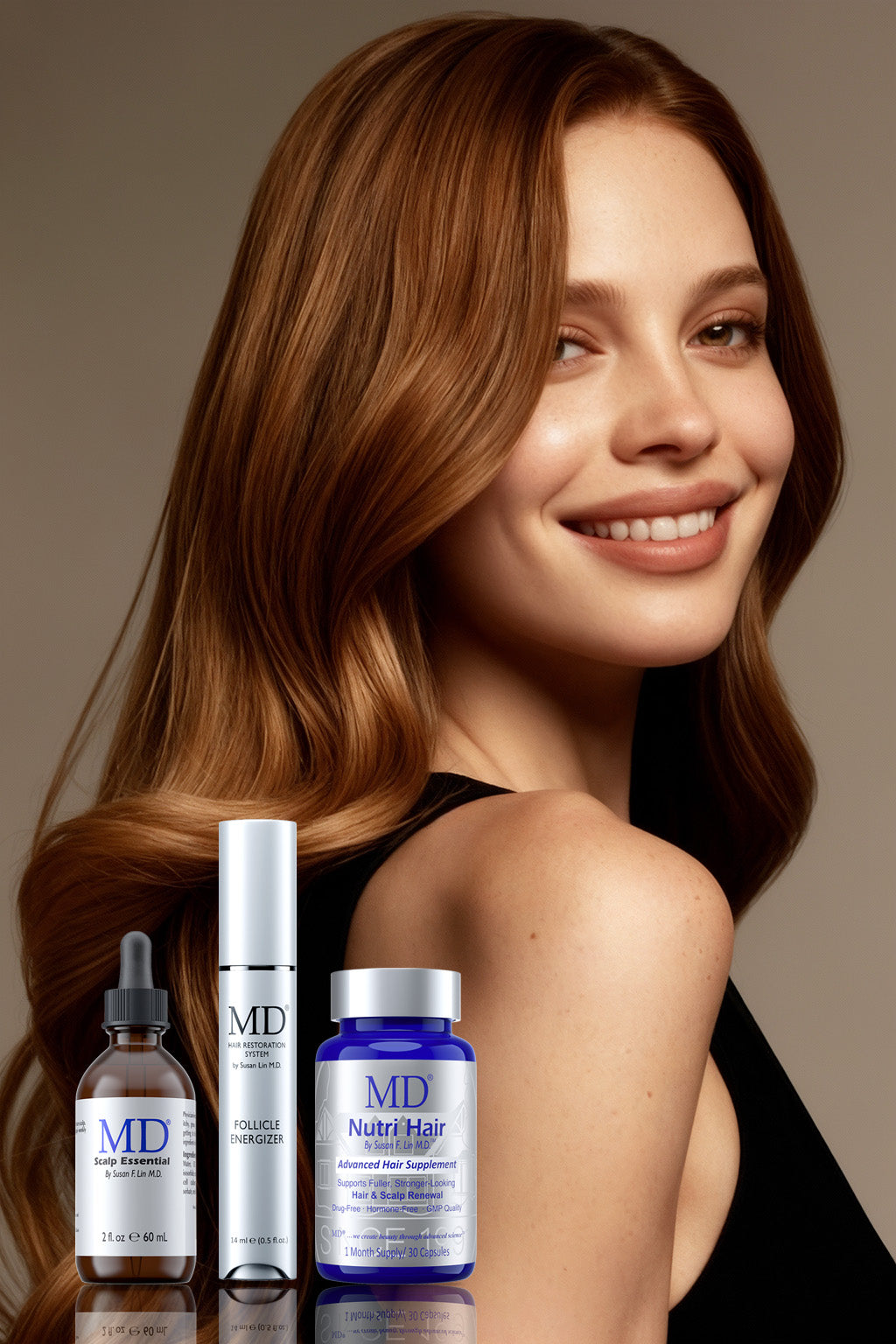Featuring a beautiful model with thick, lustrous hair, MD Hair Restoration Starter Kit is clinically formulated to revitalize hair density and shine with nourishing botanicals and strengthening actives.